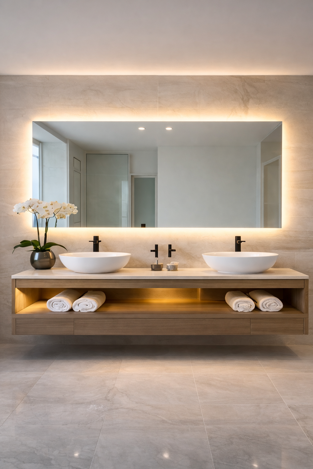 Scope: Full-width custom mirror with integrated sconce cutouts and polished edges.