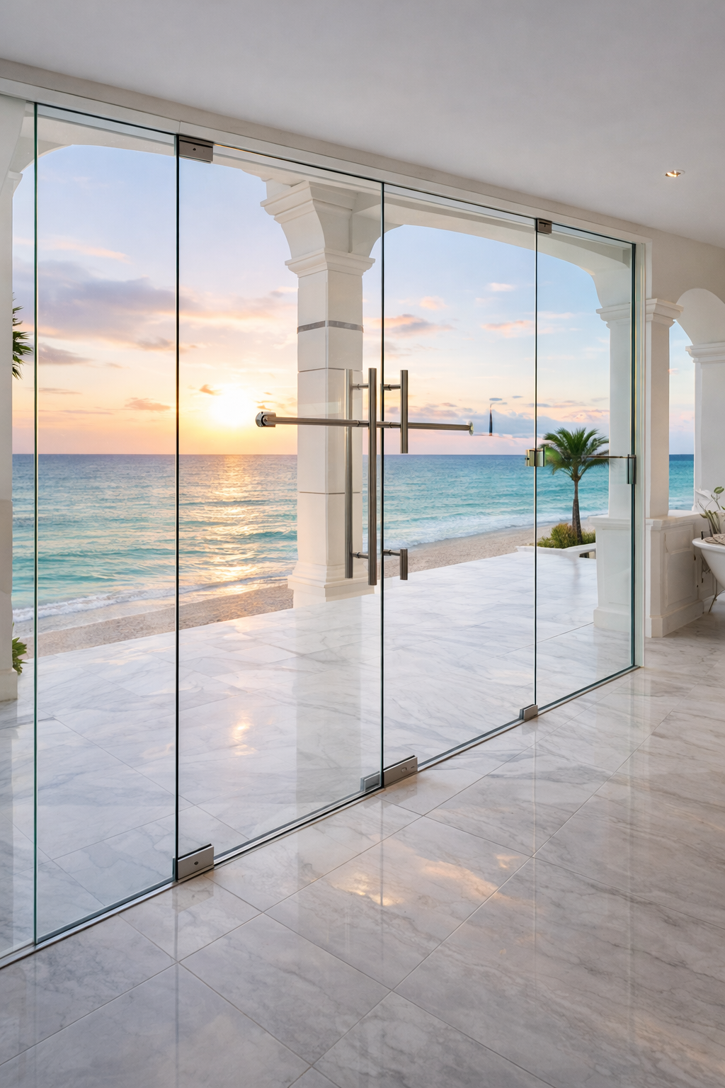 Bright, coastal glasswork with seamless hardware and crystal-clear reflections.